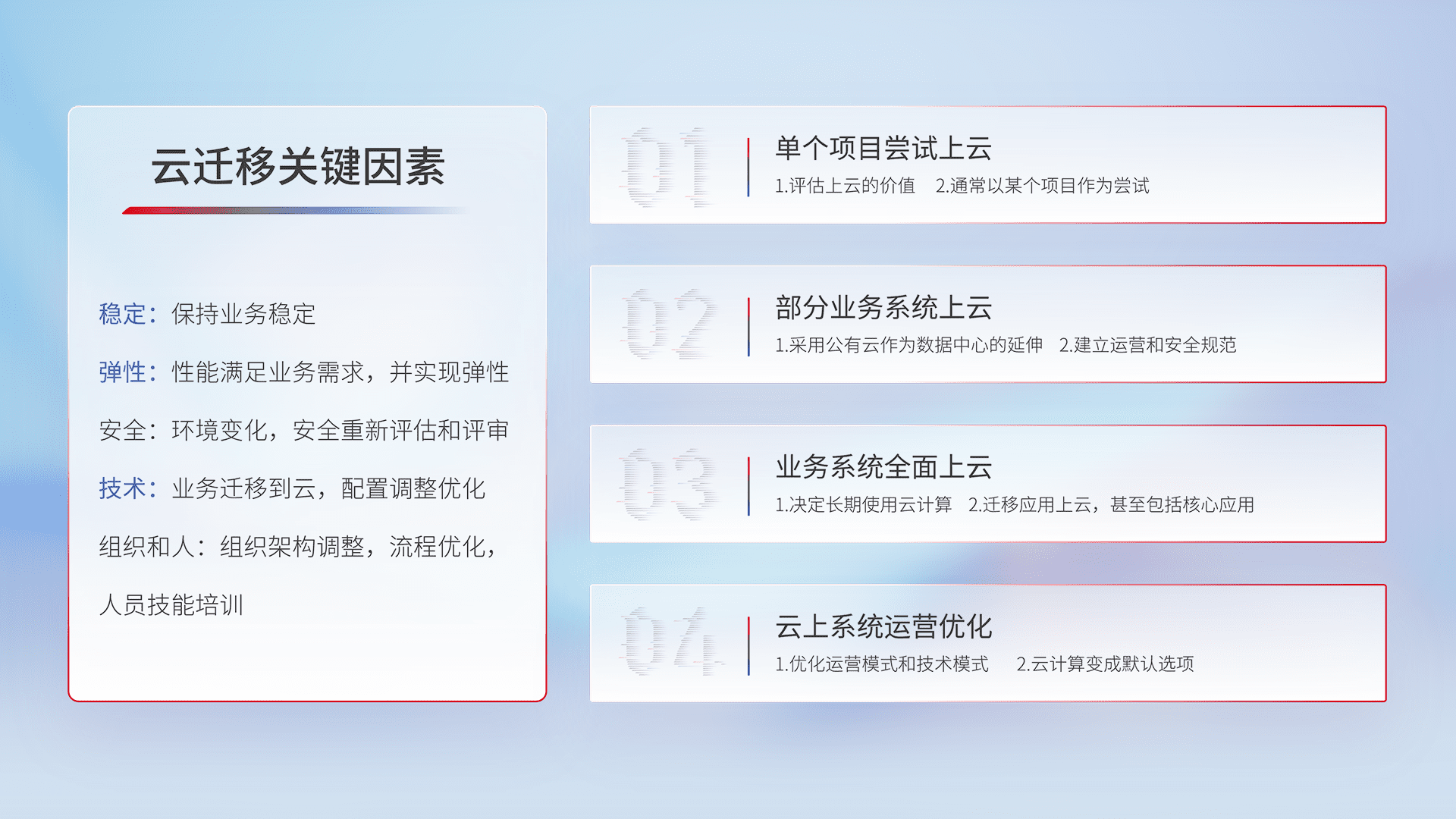 结合实际业务,,从规划设计、、云平台选型、、云原生改造、、、、数据迁移、、、集成交付,,,,迁移全过程为客户识别最佳上云路径,,,,做好风险识别管理,,,设计网络架构、、身份权限、、、、安全审计合规、、、、操作审计、、、、日志审计、、、、监控告警策略、、、、多站点容灾设计等,,,对云上基础设施进行整体规划,,,提升IT治理水平,,,以满足弹性、、、、高可用、、高性能的需求。。。。