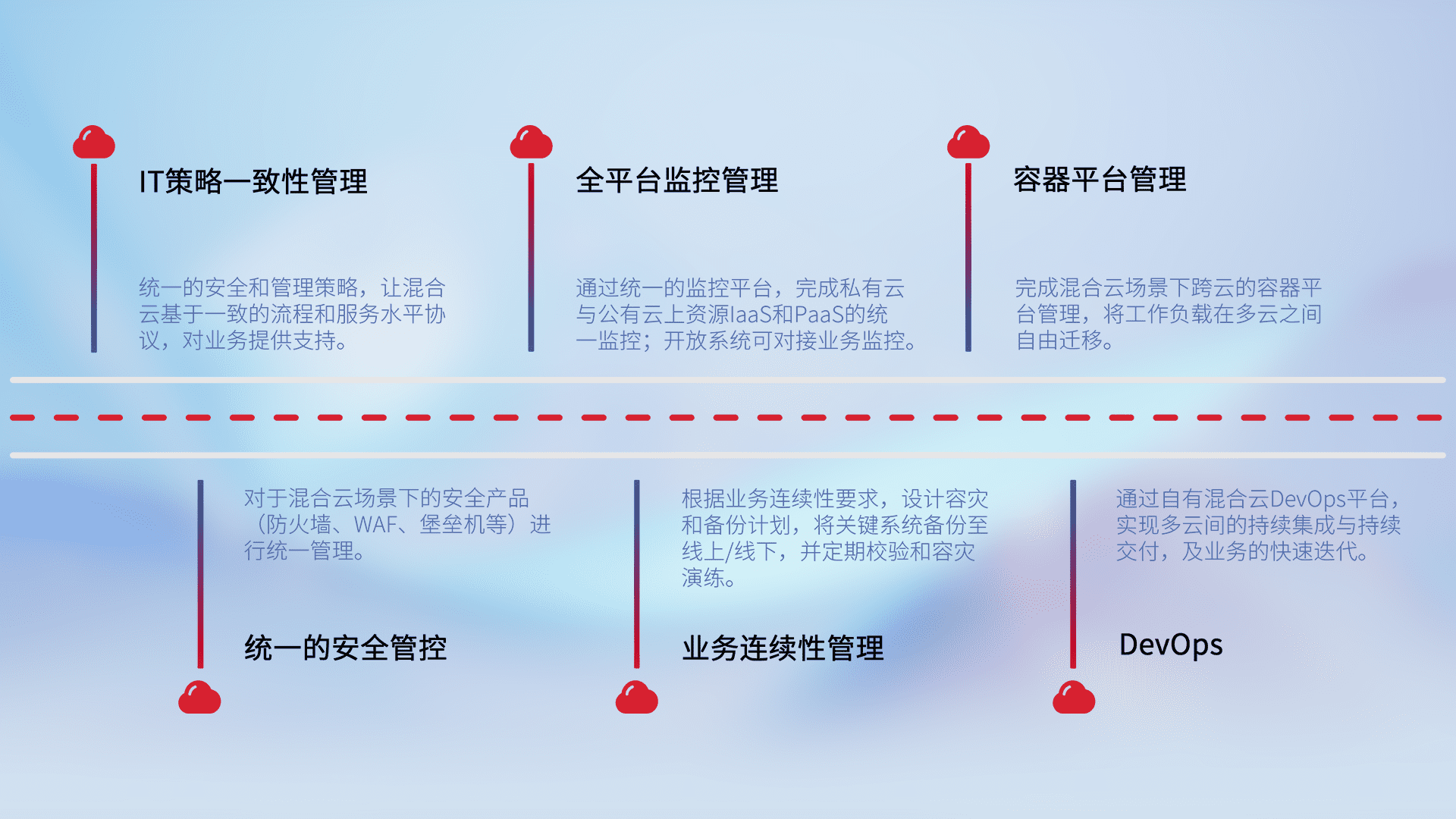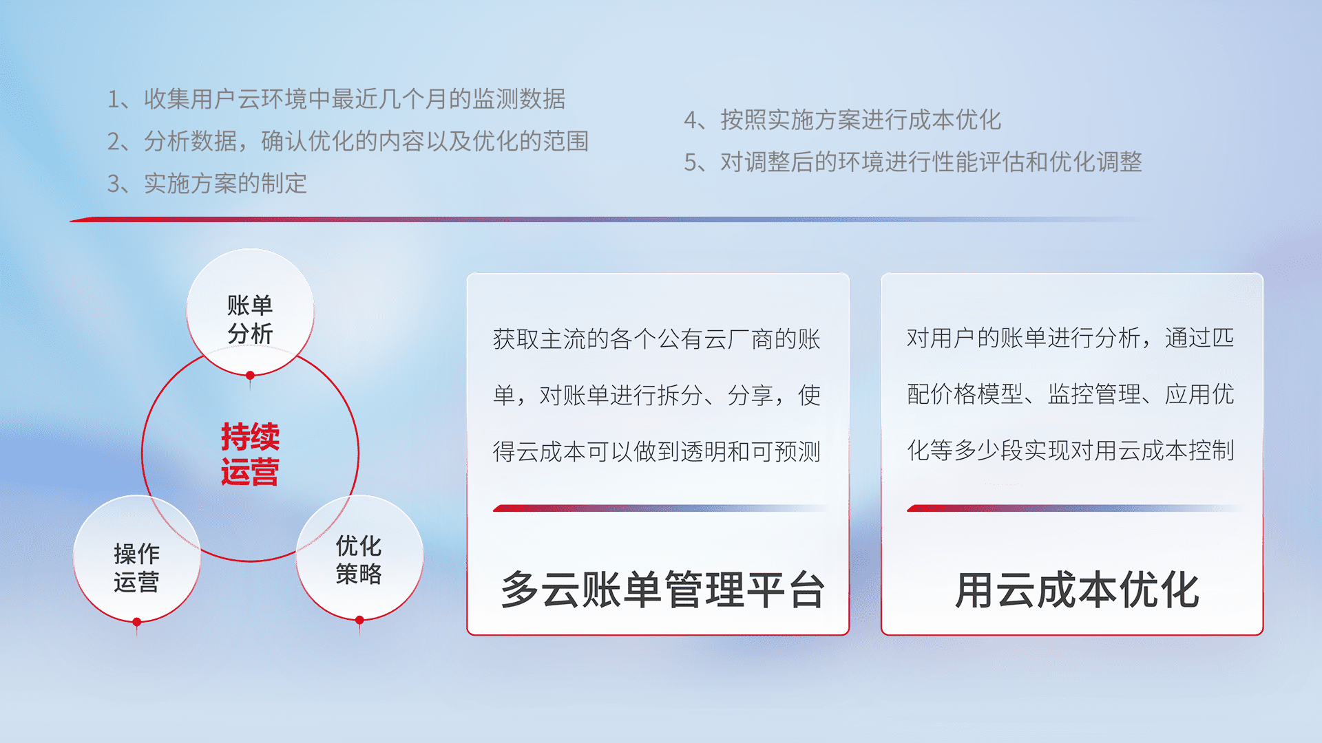 通过多云纳管,,,,以统一的资源数据模型把客户的云资源进行抽象和封装,,,,进而实现对多云资源的统一操作,,,,保障云资源管理的可靠性、、、、稳定性与可用性。。量身定制化运维内容,,配置、、、、开发运维、、、补丁管理、、、备份、、、、监控、、认证和访问管理、、、、审计和日常巡检等,,,保障在用云过程中的可靠度,,,稳定度以及高可用率。。。。